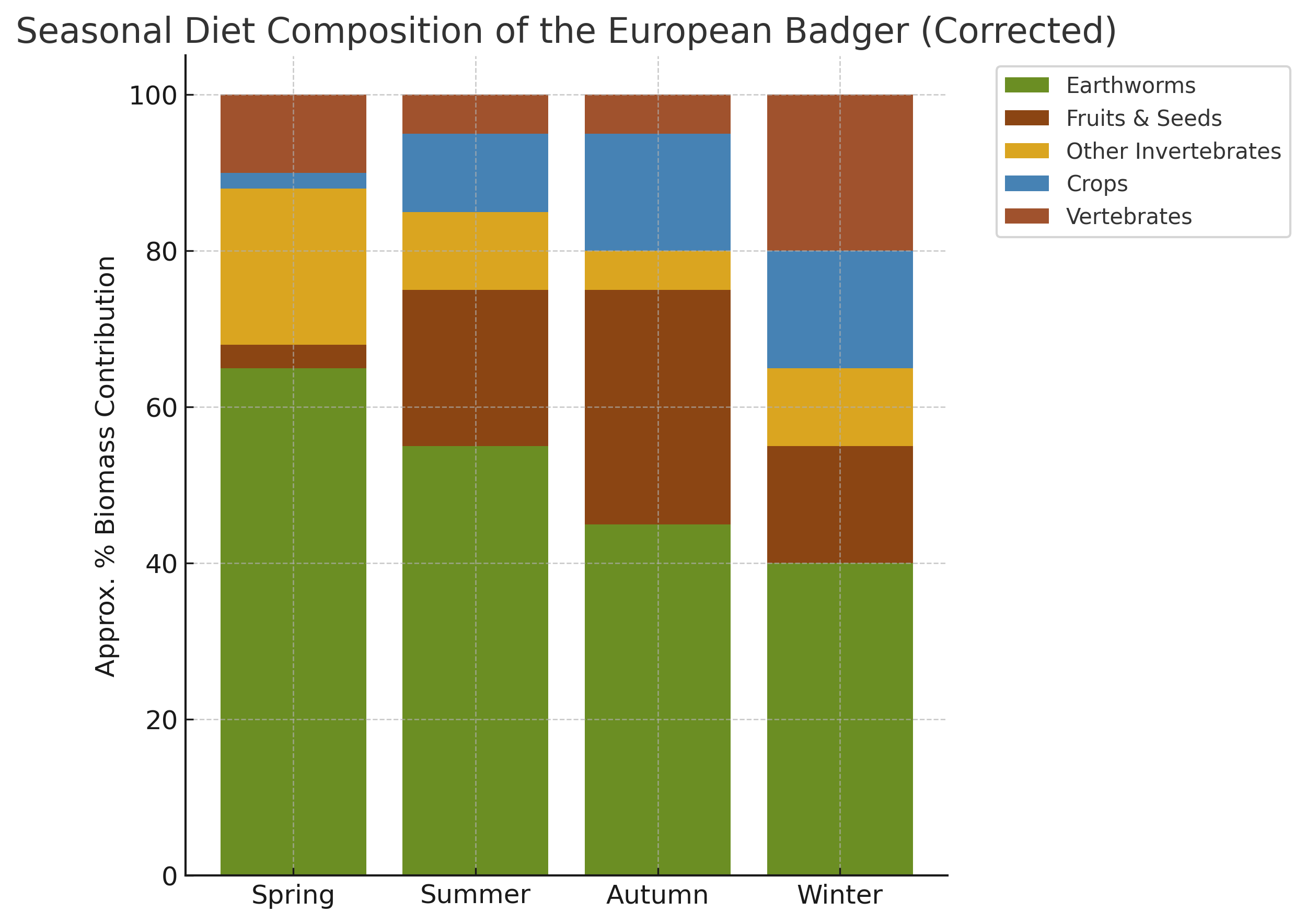 The diet of the European badger is dominated by a small number of key food items, supplemented opportunistically (Kruuk 1978; Macdonald & Newman 2002). Corrected figures ensure each seasonal profile sums to ~100%.