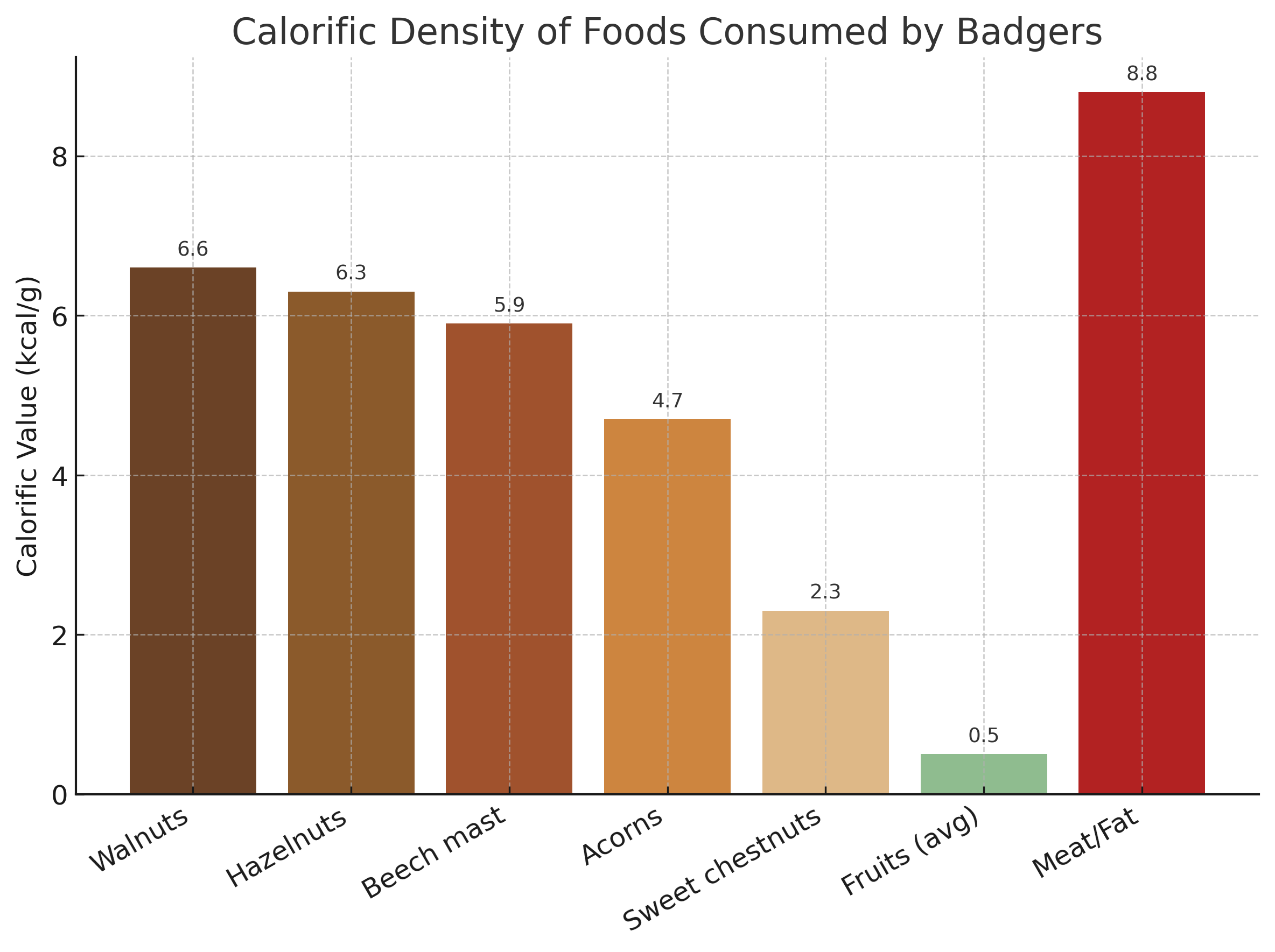 This explains why badgers gorge on walnuts, hazelnuts, beech mast, and acorns during September–October: they are the most profitable and predictable autumn fuel to build fat reserves before winter semi-torpor.