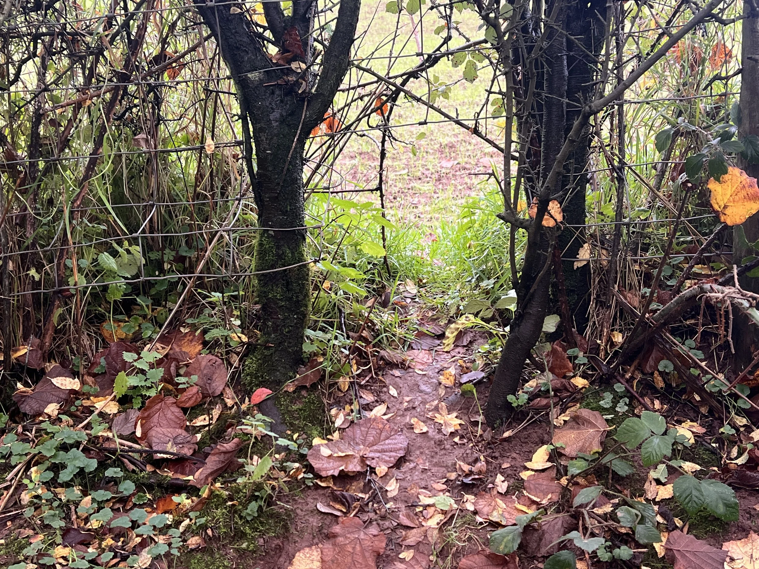 flattened grass, narrow tunnels, fresh tracks after rain, hair on lower barbed wire, smooth soil from repeated use.