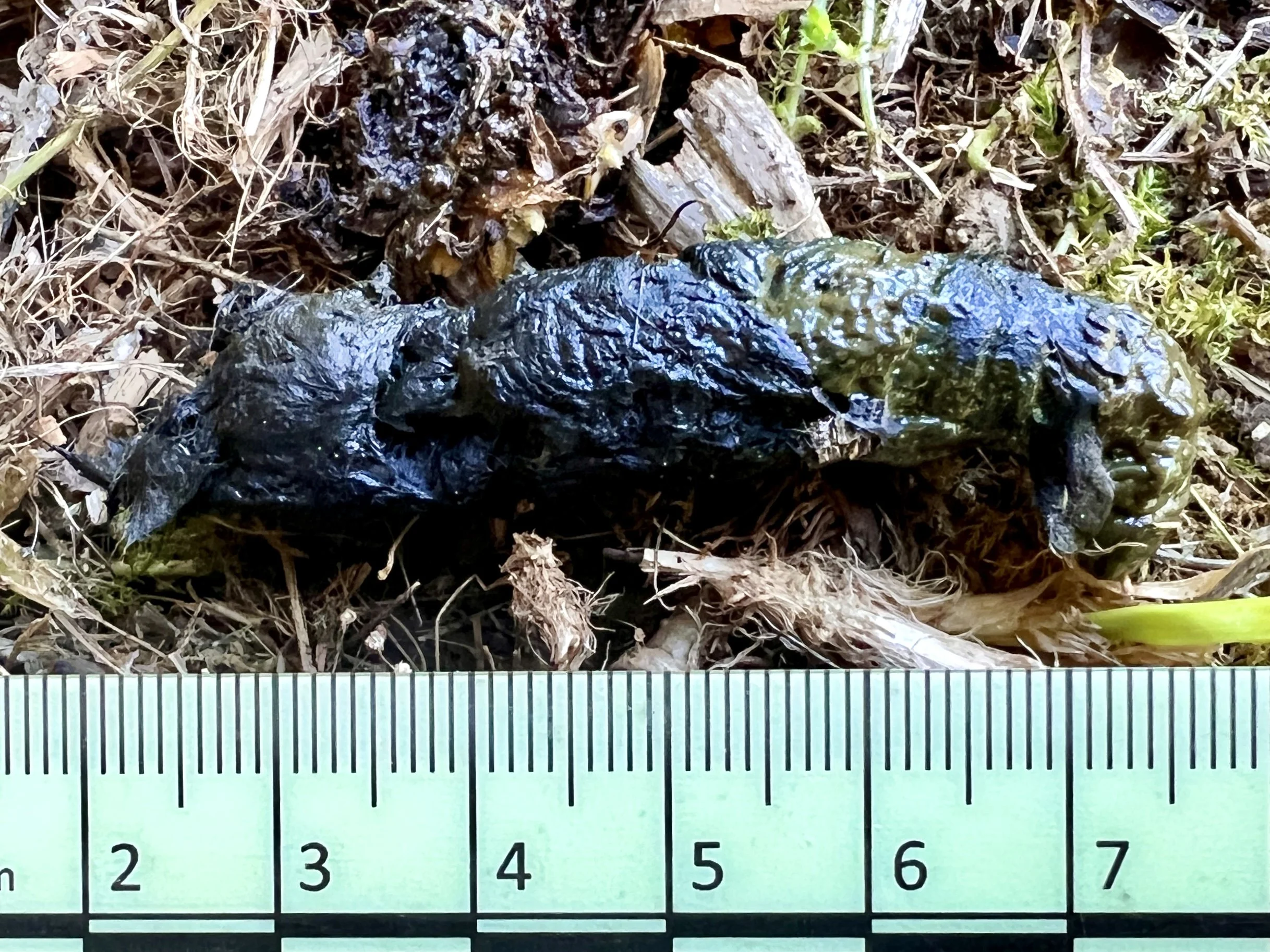 Fox droppings are typically twisted at one end, often left on prominent features such as paths, rocks, or grassy tussocks, and contain fur, feathers, or small bones. They’re deliberate scent marks.